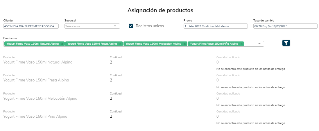 - Registros totales: Al seleccionar registros totales se esta indicando que se va a hacer una búsqueda de productos a indicar en todas las Notas de Entrega existentes tanto del Cliente principal como de la sucursal del cliente.