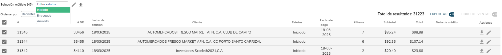 Para actualizar estatus de forma masiva, seleccionar varias facturas y hacer click en selector de Editar estatus se actualizaran todos los estatus de facturación de las facturas seleccionadas.