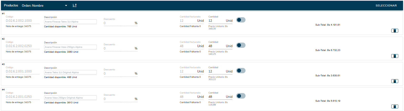 Podrá ordenar la visualización del listado por: Nombre, Código de producto, Cantidad, Precio, Descuentos, Monto subtotal para una mejor verificación.