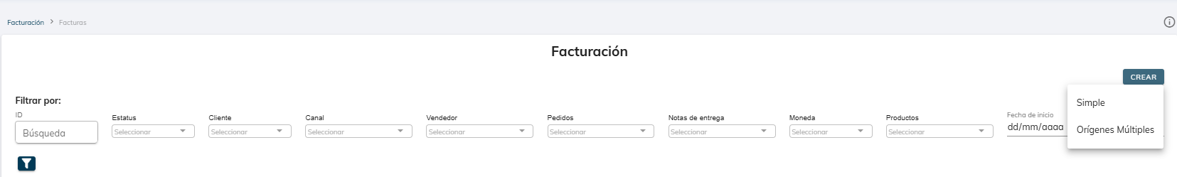 En esta sección, los usuarios pueden hacer click en el botón "Crear" y emitir facturas de dos maneras:
