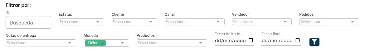Filtro "Pedidos" y "Notas de Entrega": Filtra facturas asociadas a un # pedido o # nota de entrega específica.