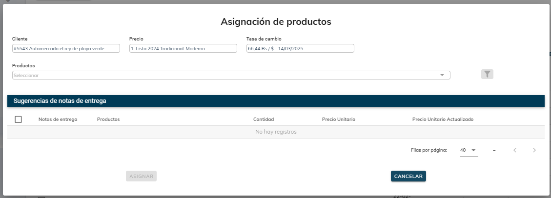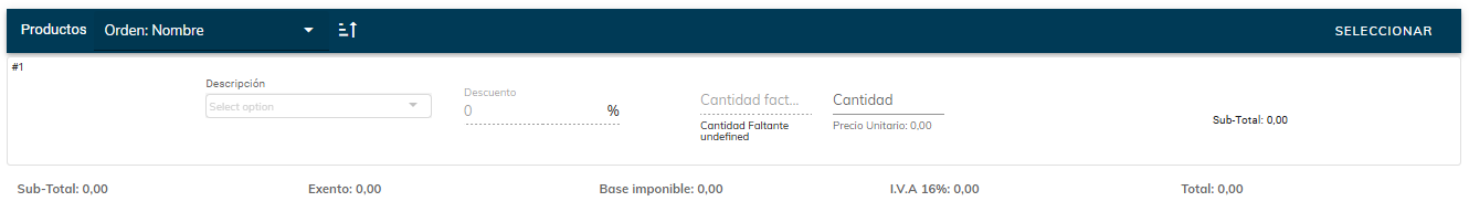 • Al presionar SELECCIONAR obtendrás el catálogo de productos que existe en el sistema, desde ahí podrás ubicar, escoger los productos que deseas facturar.image.png