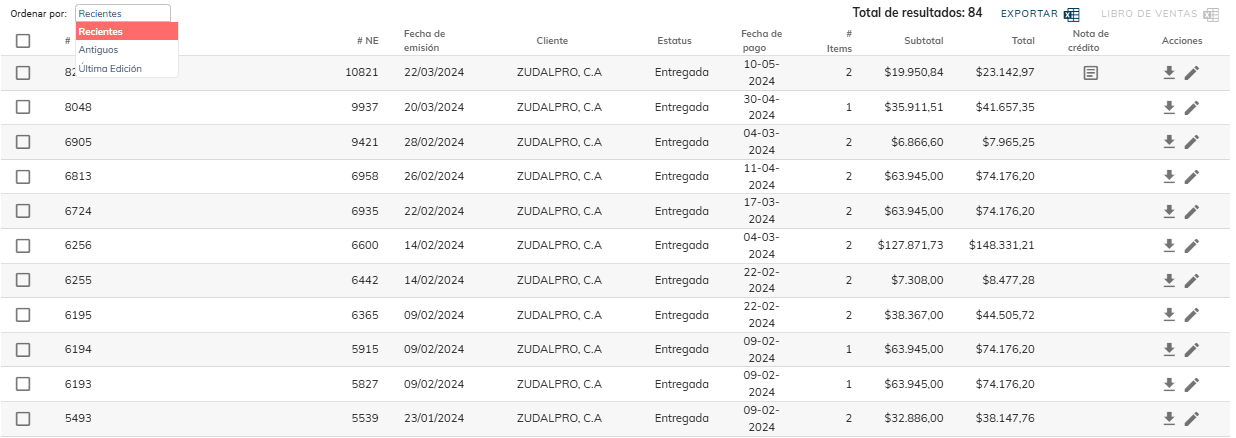 Podrás observar un resumen de las facturas, destacando algunos campos de conocimiento como lo son: # Pedido, #NE (Notas de Entregas) y elementos básicos para identificar el documento.