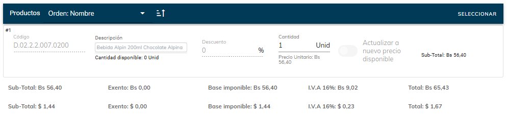 Finalmente, en la ventana previa, podrá indicar cantidad y seleccionar la lista de precios correspondiente.