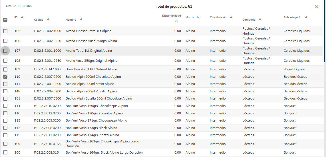 Si el error es por cantidades adicionales podrá hacerlo en el mismo listado, sino podrás incorporar nuevos productos desde la opción "SELECCIONAR" lo que abrirá una nueva modal desde donde podrá seleccionar los productos (podrás filtrar en sus distintos campos de información).