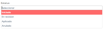 - Estatus (Esto es un listado que por defecto comienza por INICIADO), los distintos estatus que maneja son: