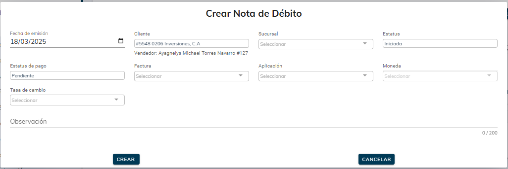 - Cliente y Sucursal (Seleccione o identifique al cliente al cual se le genera una nota de débito).