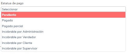 - Estatus de Pago (Esto es un listado que por defecto comienza en Pendiente), los distintos estatus que maneja son: