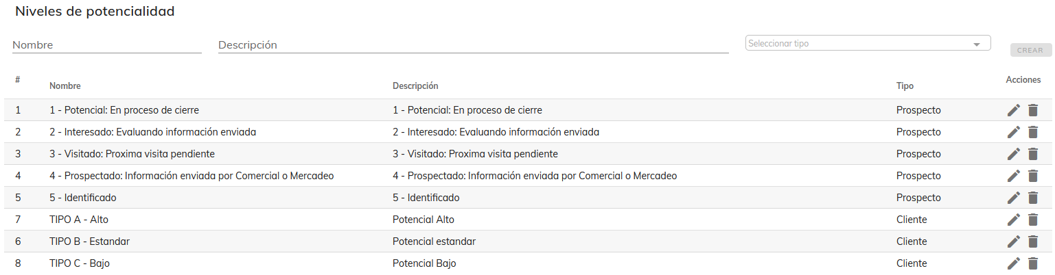 Para crear o editar un nuevo Nivel, se ingresa el Nombre, una breve descripcion, se selecciona un tipo (prospecto o clientes) y se hace clic en el botón "Crear" o "Guardar".