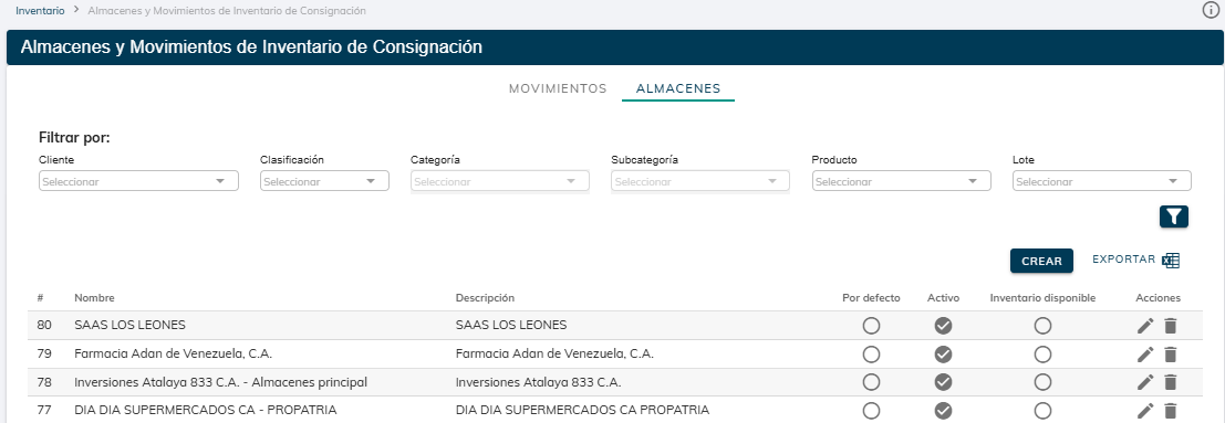 Haz click en el botón "Crear para añadir nuevos Almacenes A Consignación.