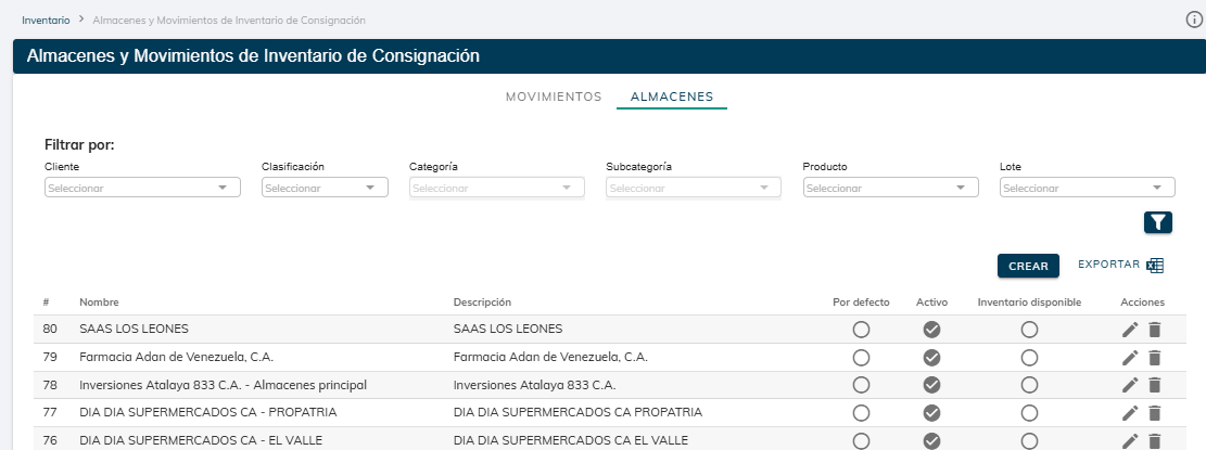 Cadena de Suministro > Inventarios > Consignación > Almacenes
