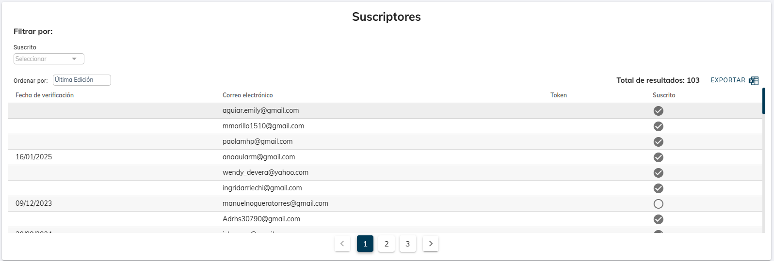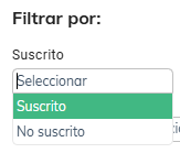 - El filtro selector de "Suscrito" permite mostrar solo los suscriptores suscritos o no (los que se registraron sin suscribirse) desde el web.